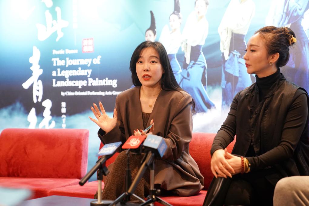 舞蹈诗剧《只此青绿——舞绘〈千里江山图〉》总编导周莉亚(右)和韩真在香港文化中心接受新华社记者采访(1月4日摄)。
