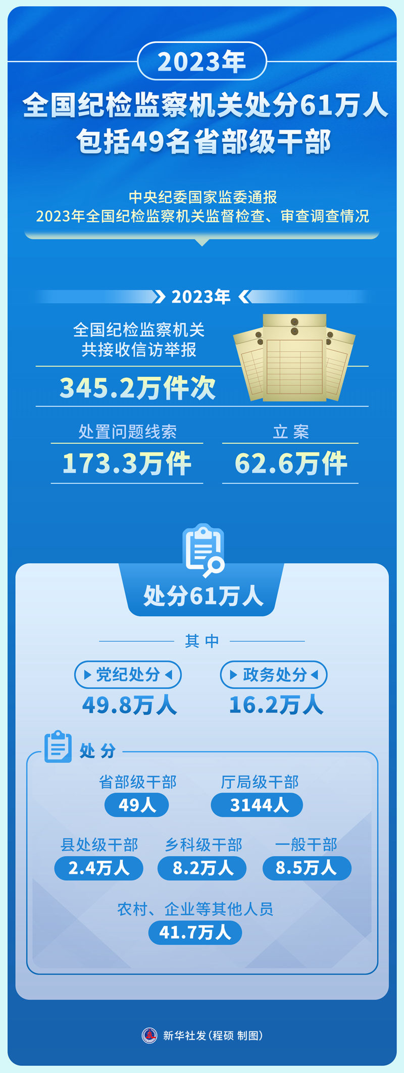 通报显示,2023年,全国纪检监察机关共接收信访举报345.2万件次,其中检举控告类信访举报105.7万件次。处置问题线索173.3万件,其中谈话函询36.3万件。立案62.6万件,其中立案中管干部87人、厅局级干部3456人、县处级干部2.7万人、乡科级干部8.9万人;立案现任或原任村党支部书记、村委会主任6.1万人。处分61万人,其中党纪处分49.8万人、政务处分16.2万人;处分省部级干部49人,厅局级干部3144人,县处级干部2.4万人,乡科级干部8.2万人,一般干部8.5万人,农村、企业等其他人员41.7万人。