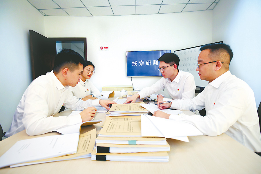 图为近日,上海市青浦区纪委监委工作人员针对干部档案造假问题进行线索研判。马成思 摄