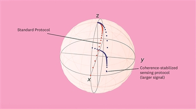 由于退相干,量子比特状态向球体的“北极”衰减。利用本研究中的相干稳定传感协议,研究人员暂时抵消了这种衰减,导致本研究协议(蓝色)中的传感信号(y分量)比标准协议(红色)中更大。图片来源:美国南加州大学