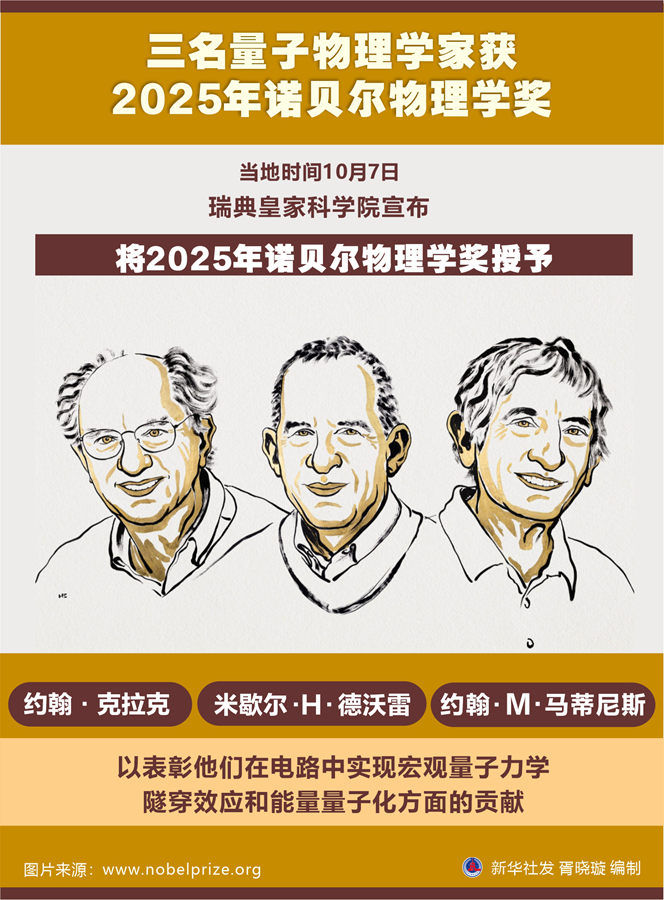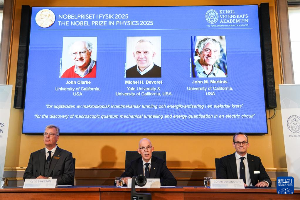 新华社斯德哥尔摩10月7日电(记者郭爽 张兆卿)在量子力学诞生百年之际,瑞典皇家科学院7日宣布,将2025年诺贝尔物理学奖授予约翰·克拉克、米歇尔·H·德沃雷和约翰·M·马蒂尼斯三名量子物理学家,以表彰他们在电路中实现宏观量子力学隧穿效应和能量量子化方面的贡献。