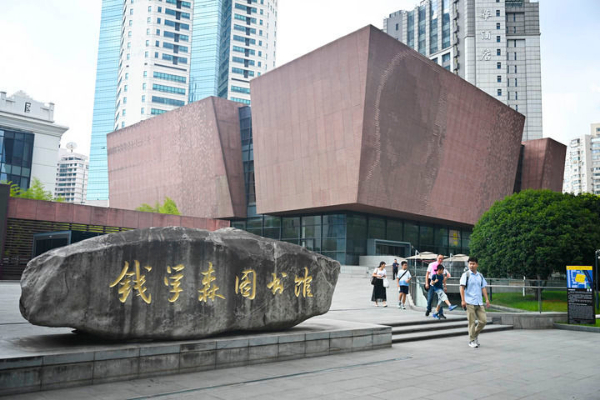 2025年10月6日,观众走出上海交通大学钱学森图书馆。新华社记者 陈浩明 摄