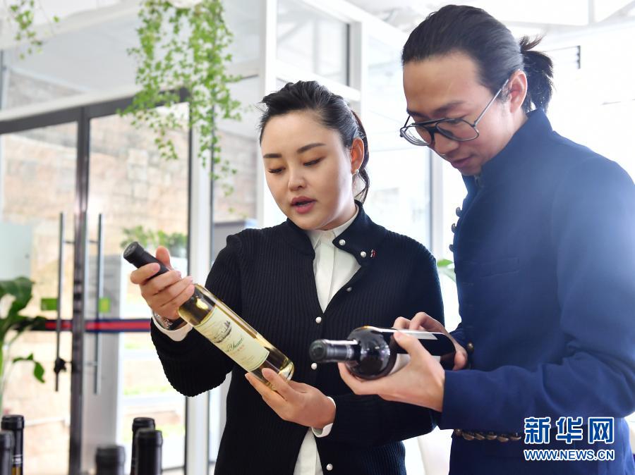 1月14日,张程程(左)在位于西安市鄠邑区胡家庄村的田园综合体与同事探讨一款红酒产品。新华社记者 张博文 摄