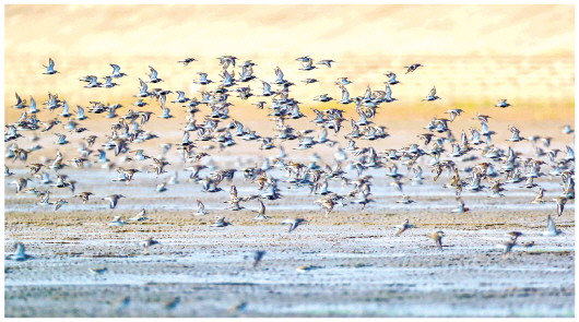 东台条子泥湿地,黑腹滨鹬、沙鸻等候鸟成群飞翔。受访者供图