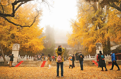 北京潭柘寺的两株古银杏树,已经有一千三百年的树龄。(图片来源:中新网)