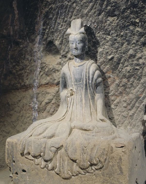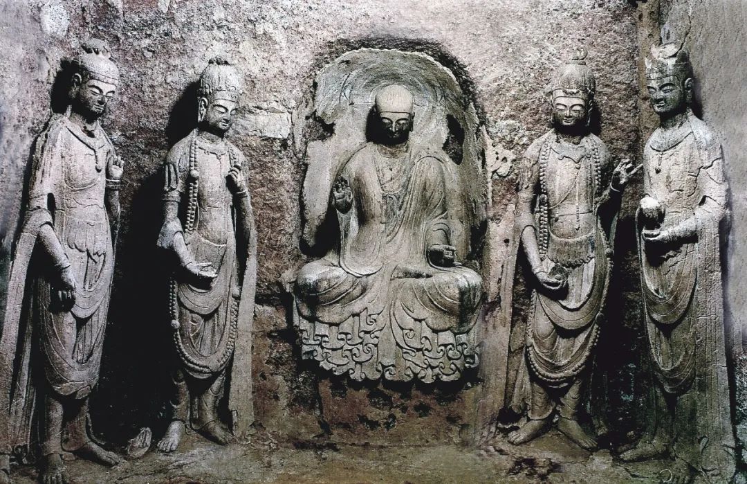 它一改西魏造像繁缛华丽、服饰厚重的特点,无论是佛、菩萨、弟子,还是飞天和力士,服饰轻柔而贴体,均展现出一种雄健挺拔、恬静自然的气韵,面相方圆,五官清秀而紧凑。佛低平肉髻,身穿圆领通肩或垂领式袈裟,衣裾下摆紧贴佛座,阴刻圆润流畅的褶皱纹。菩萨也由束发高髻改为头戴花冠,周身饰璎珞,体姿婀娜而不失端庄。
