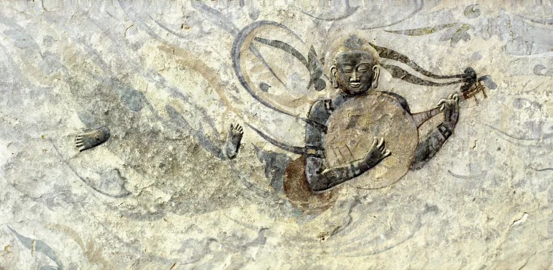 ▲第4窟顶部薄肉塑伎乐飞天,北周时期。