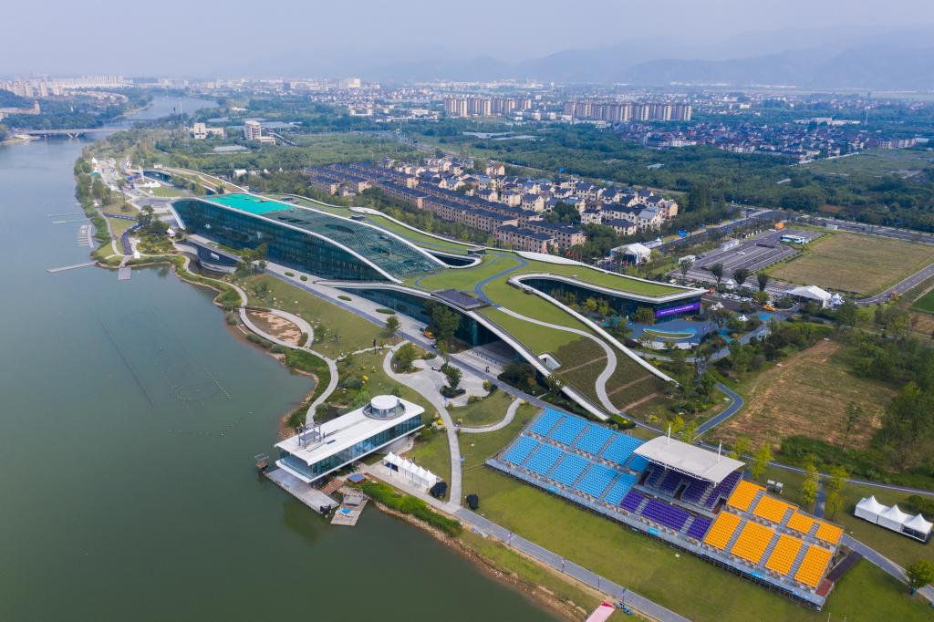 8月24日,空中俯瞰杭州富阳水上运动中心,屋顶被绿植覆盖。新华社记者 徐昱 摄