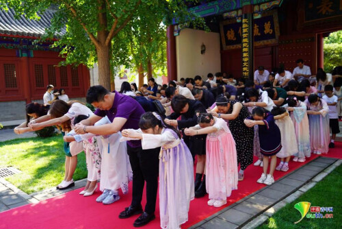 “一拜孺子启蒙,青云有路,鱼水化龙。 二拜德蒙先庇,先圣之道,功过古今。三拜格物致知,修身治齐,自强不息......”伴随着司仪的口令和舒缓雅致的礼乐,学生们在家长的陪伴下穿过大成门,在孔子像前礼拜先师孔子。