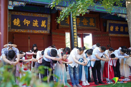 府学胡同小学举行四年级学生“入泮礼”,师生和家长在孔子像前礼拜先师孔子。中国青年网记者田昕禾 摄