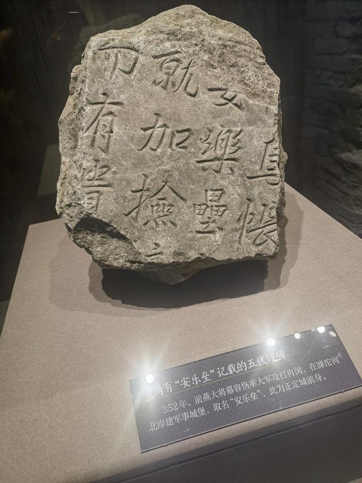 351年,前燕大将慕容恪在正定一带筑安乐垒,一般认为安乐垒即今正定城前身。正定博物馆里有安乐垒大门模型,门额大字取自石碑残块,那块原件在模型旁边展出。