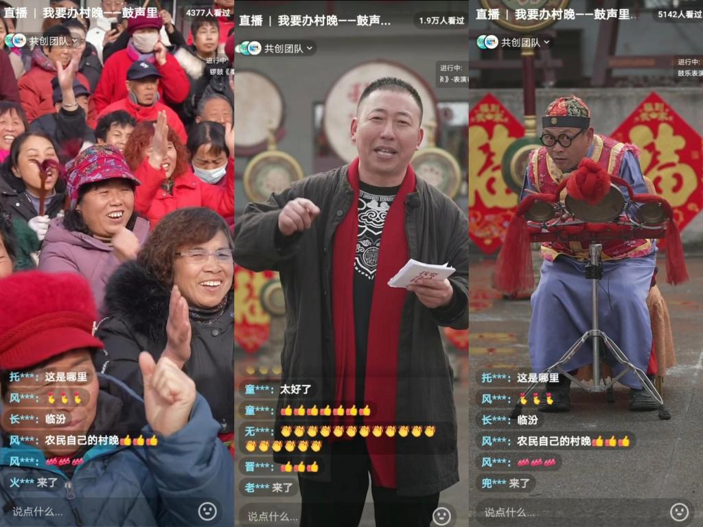 如今,老艺人们开通了直播,平时每场直播都有几千粉丝在线观看。听到主持人现场喊麦“在线观看已接近800万人次”,老艺人们瞬间元气满满,他们肩挂大鼓、矫健腾挪、奋力擂槌,气势磅礴。直播间的观众点赞连连,纷纷评论“村晚里面年味浓”“听见锣鼓声我想早点回家过年”“活力四射咱大爷”……