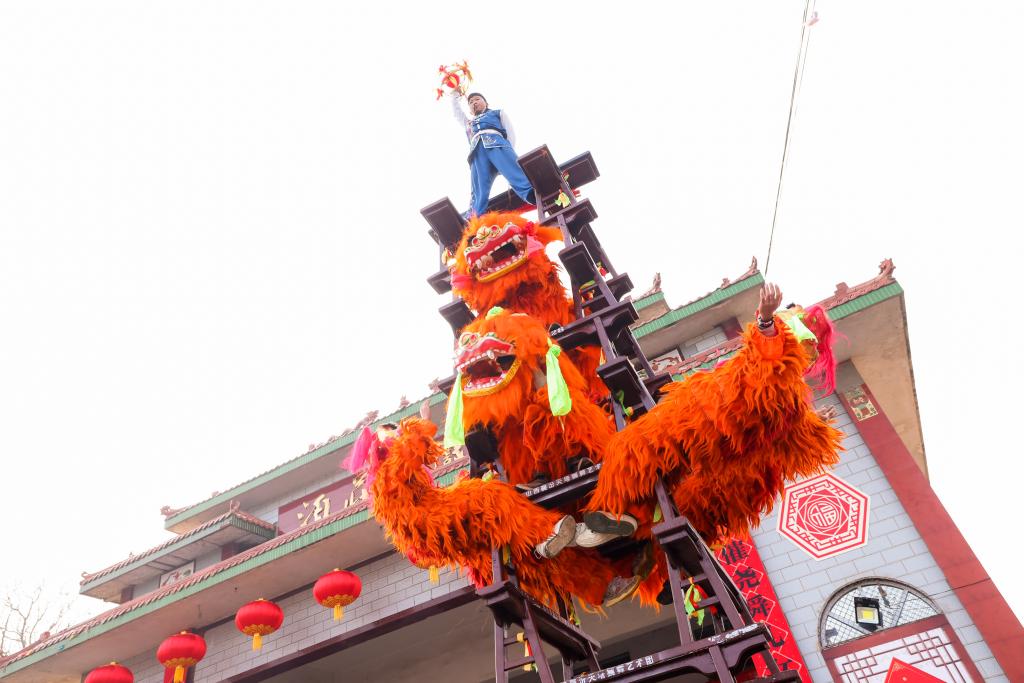 村民们在表演民间传统节目《狮子爬山》。新华社记者 赵阳 摄