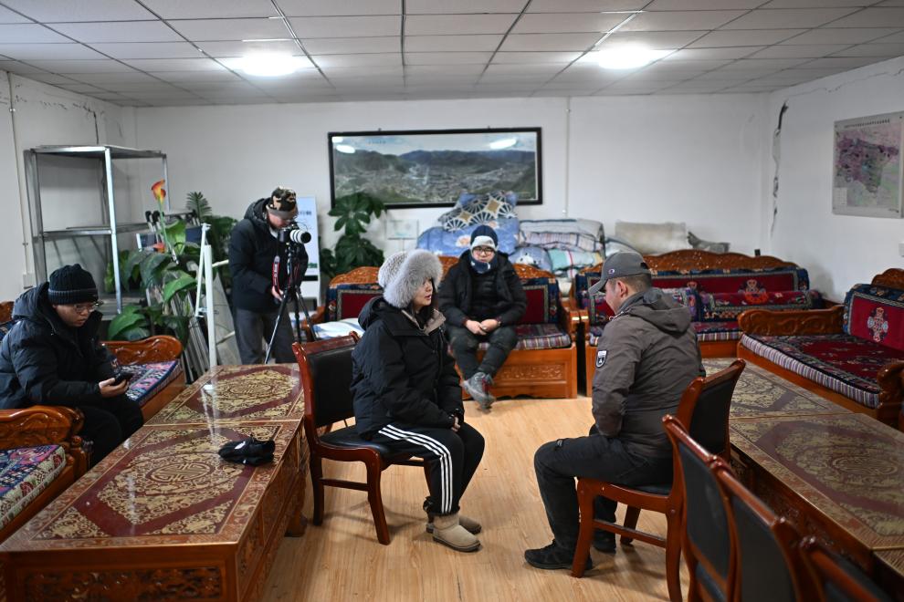 记者在索南达杰保护站宿舍内采访巡山队员(1月19日摄)。新华社记者张宏祥摄