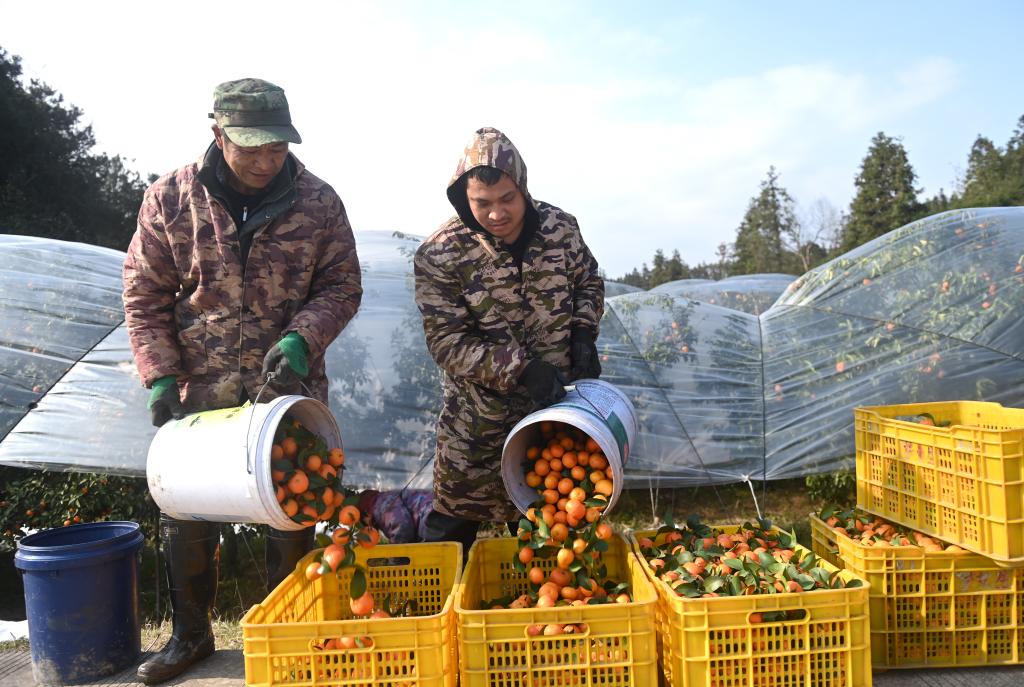 塑料膜下,砂糖橘抵御着阵阵寒风,罗家父子背对背忙碌着。不一会儿,二人已将桶内装满砂糖橘,来到路边,共同把“甜蜜”倒入筐中。