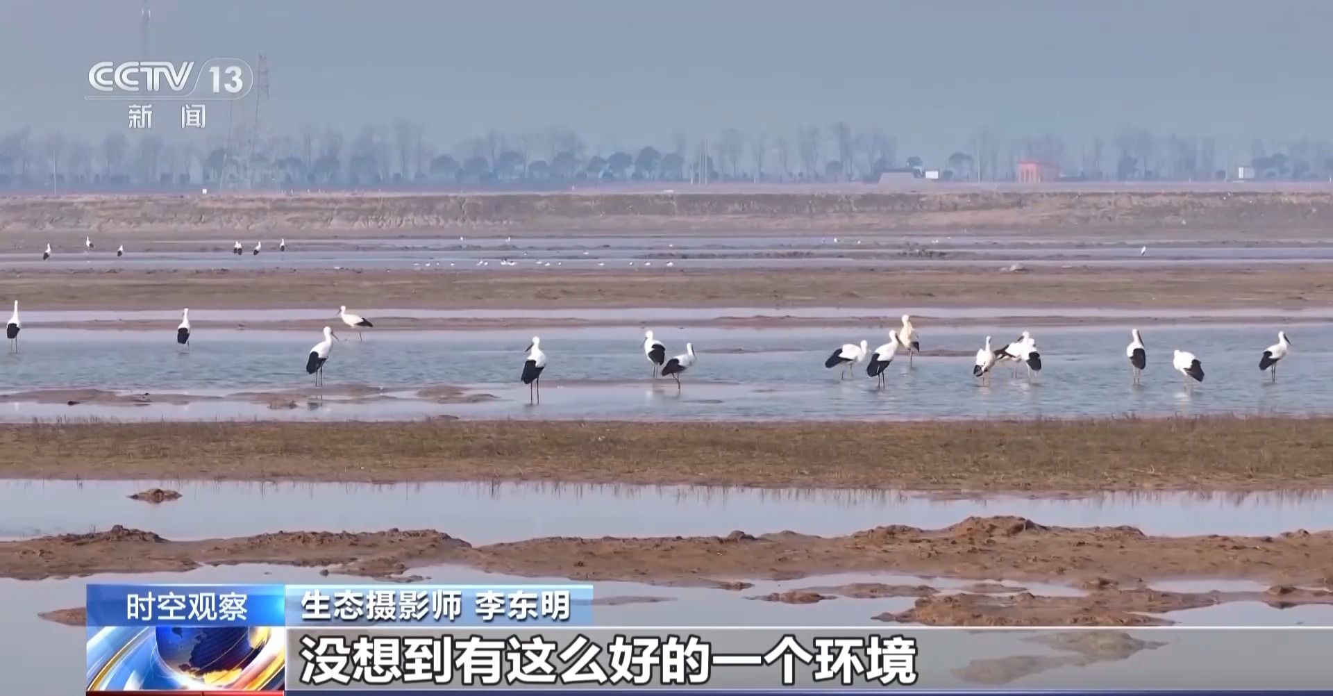 生态摄影师 李东明:没想到有这么好的一个环境,鸟类过来得这么多。上午我去看的时候,东方白鹳就看到80多只,创这里鸟类的一个新的纪录。