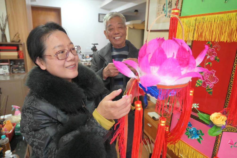 1月14日,花灯爱好者杨蓉(左)在制作福州传统小花灯。