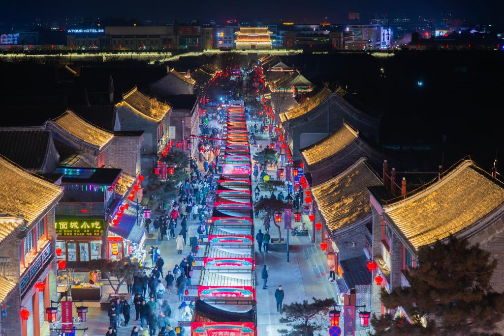 正月的“民俗大庙会”上,贯穿全天的民俗演艺轮番上演,游人在古城边逛边看。游客高明宇带着孩子游览古城,感受过年氛围。“我们观看了踩高跷、舞龙舞狮等民俗杂技表演,和铜人雕塑合影拍照,特别开心,孩子感觉很新奇。”