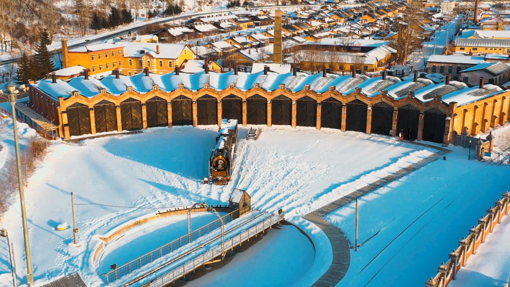 横道河子镇中东铁路博物馆是小镇里6栋国家级文物保护单位之一。百年火车头似乎能触摸到工业革命的脉搏,15个漆黑的大门扇形排开,犹如一台拉开的手风琴。