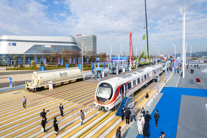 这是2023年12月8日在株洲国际会展中心拍摄的2023中国国际轨道交通和装备制造产业博览会户外展示区(无人机照片)。新华社记者陈思汗 摄