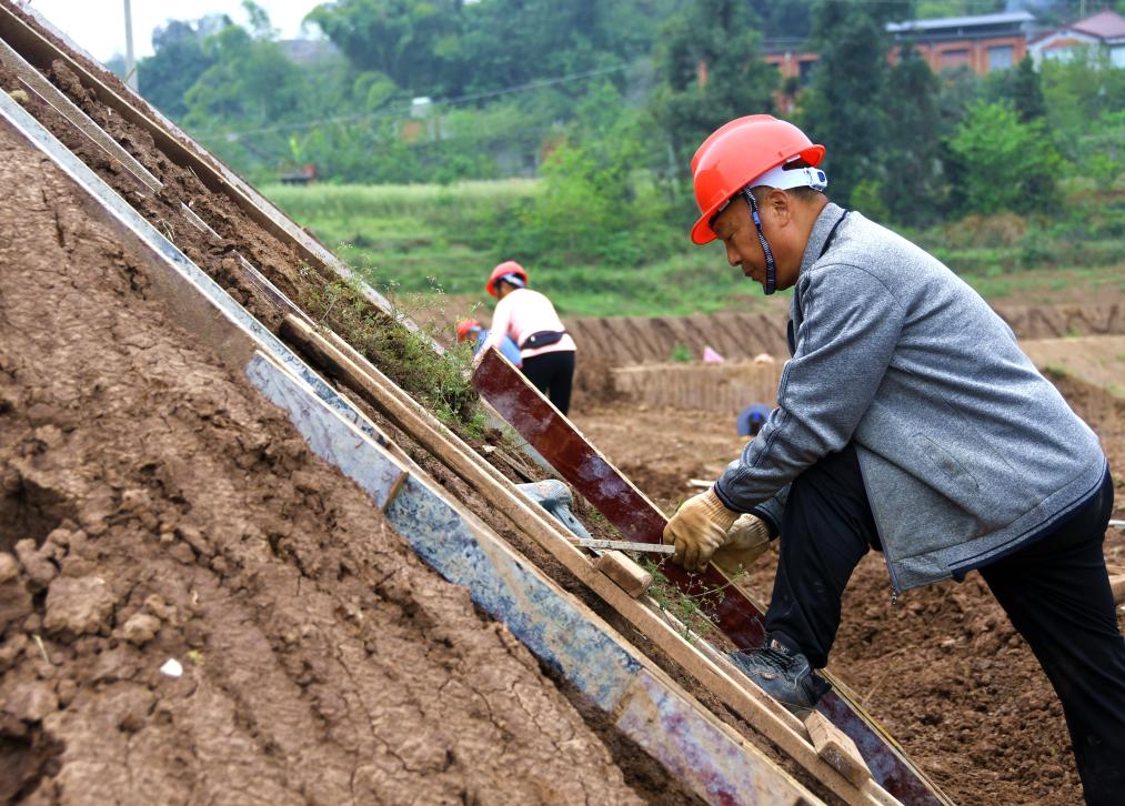 4月9日,在四川省内江市资中县一处高标准农田建设工地上,工人正在施工。新华社记者高健钧 摄