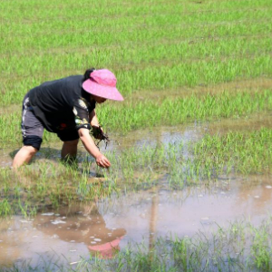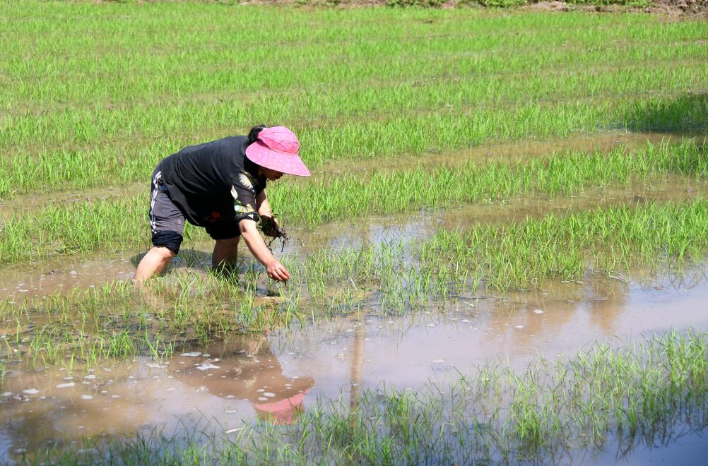 记者来到四川省达州市通川区蒲家镇乐云村,看到波光粼粼的水田里一片翠色。此时,乐云村村民张其竹正弓着腰,专心致志在田间拔除杂草。