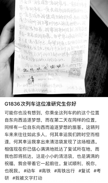 “现在我正坐在前往复试的高铁上,我迷茫焦虑,又对未来充满期待……祝千千万万个我都顺利上岸,祝千千万万个我们都心想事成。”清洁袋上的字迹隽秀有力,写于今年3月26日,在G1836次列车上。