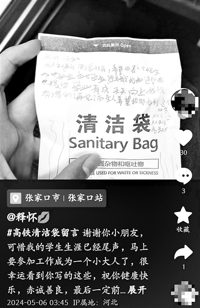 一些乘客把清洁袋当成了留言板,写下对陌生人的祝福。5月6日,网友“释怀”在从北京开往张家口的高铁上收到一位北京小学生在清洁袋上的留言:“你好陌生人,我不知道要说什么,希望你是一个小学生、中学生和大学生,因为我写的和这些有关。祝你学业有成,天天向上。”