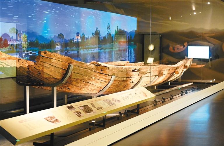 陕西历史博物馆秦汉馆展出的汉代古船“丝路一号”(5月6日摄)。(新华社记者 李一博 摄)