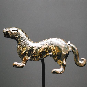 2017年大型文博探索类节目国家宝藏中,陕历博入选了3件国宝,杜虎符就是其中之一。讲解员介绍,“杜”是指秦国的杜县,在今天西安的长安区;“符”是古代朝廷用于传达命令、调动军队的凭证,通常作虎形,分为左右两半,两半相合之后才可调兵遣将。杜虎符身上铸有错金铭文9行共40个字,大意是说杜虎符分为左右两半,右半掌握在国君手里,左半由大将掌管,凡调配50人以上的兵力,必须有国君的命令,将兵符对合后,才能够调兵遣将。杜虎符的应用充分说明了秦国军权的高度集中。