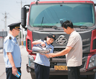 河北省邢台市羊范联合治超站工作人员为货车司机送绿豆汤。新华社记者 牟 宇摄