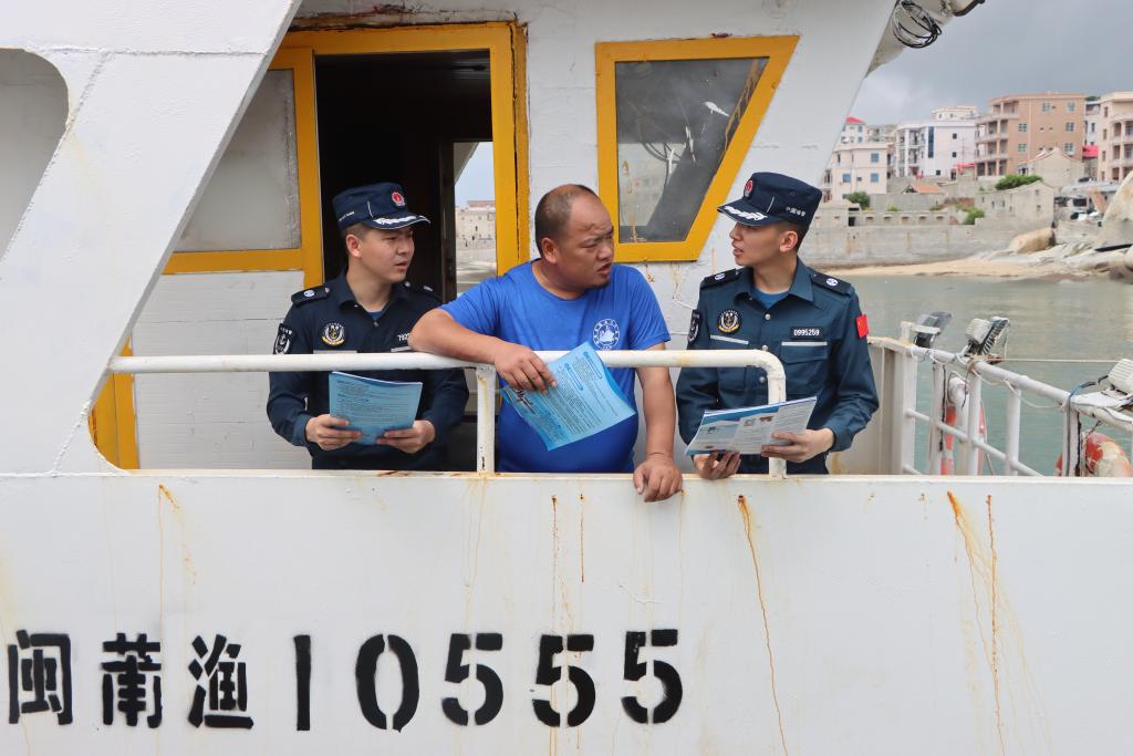 8月16日上午,莆田海警局秀屿工作站工作人员在渔船上开展普法宣传。(受访者供图)