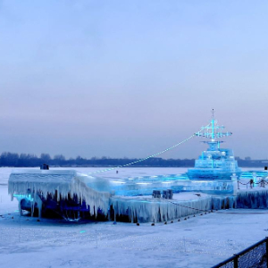 阳光下,“冰航母”稳稳矗立在冰封的江面上,舰身晶莹剔透,线条刚硬流畅,十分壮观。入夜后,在灯光装饰下,它像被施了魔法,通体散发出蓝色光芒。