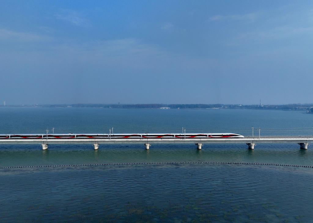 列车驶过沪苏湖高铁元荡湖段(无人机照片)。 新华社记者 邢广利 摄