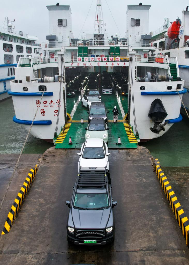 1月14日,在海南省海口市秀英港,车辆有序驶离客滚船(无人机照片)。新华社记者 杨冠宇 摄