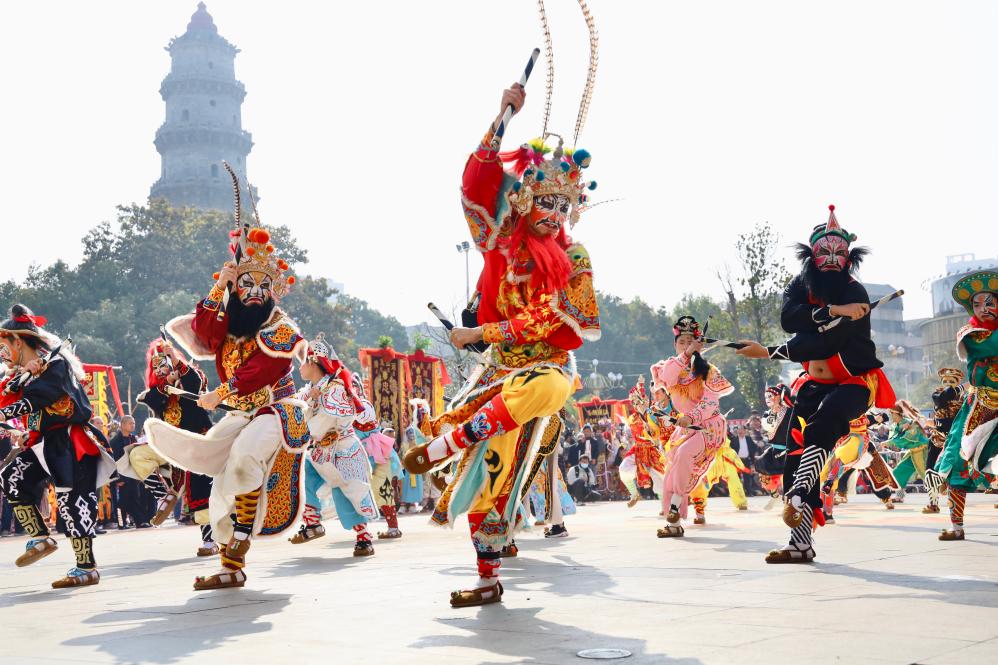 2024年2月14日上午,近千名潮阳英歌舞队员在潮阳城区文光塔广场同台“斗舞”贺新春。(汕头市潮阳区委宣传部供图)