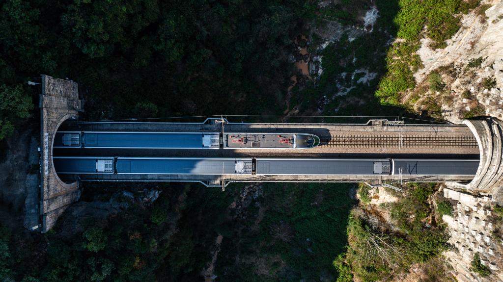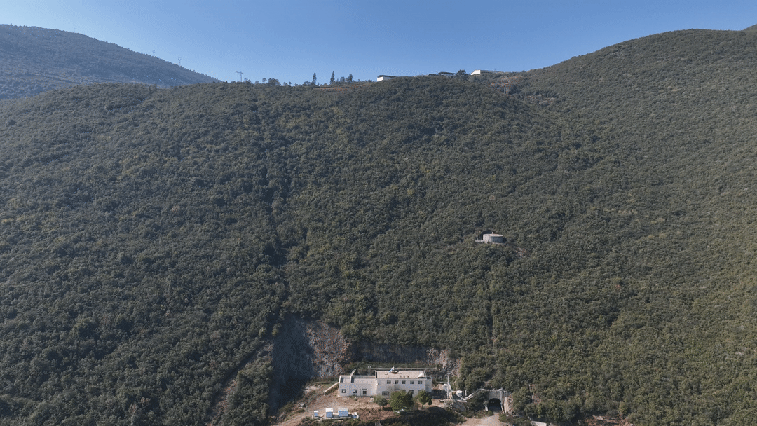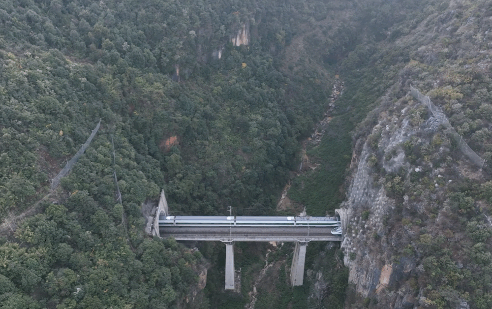 空中俯瞰位于大山中的诸葛城站站房,车站股道建在站房后的“山肚子”里。
