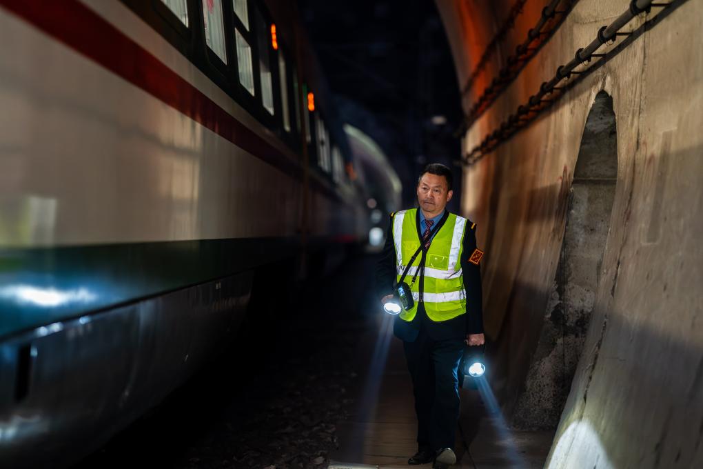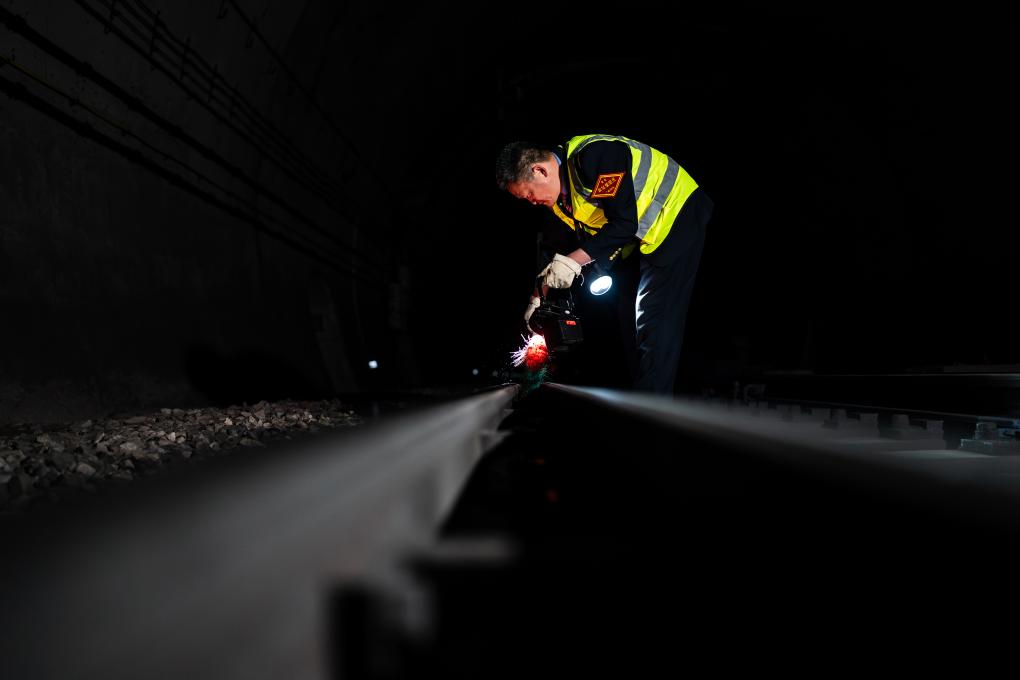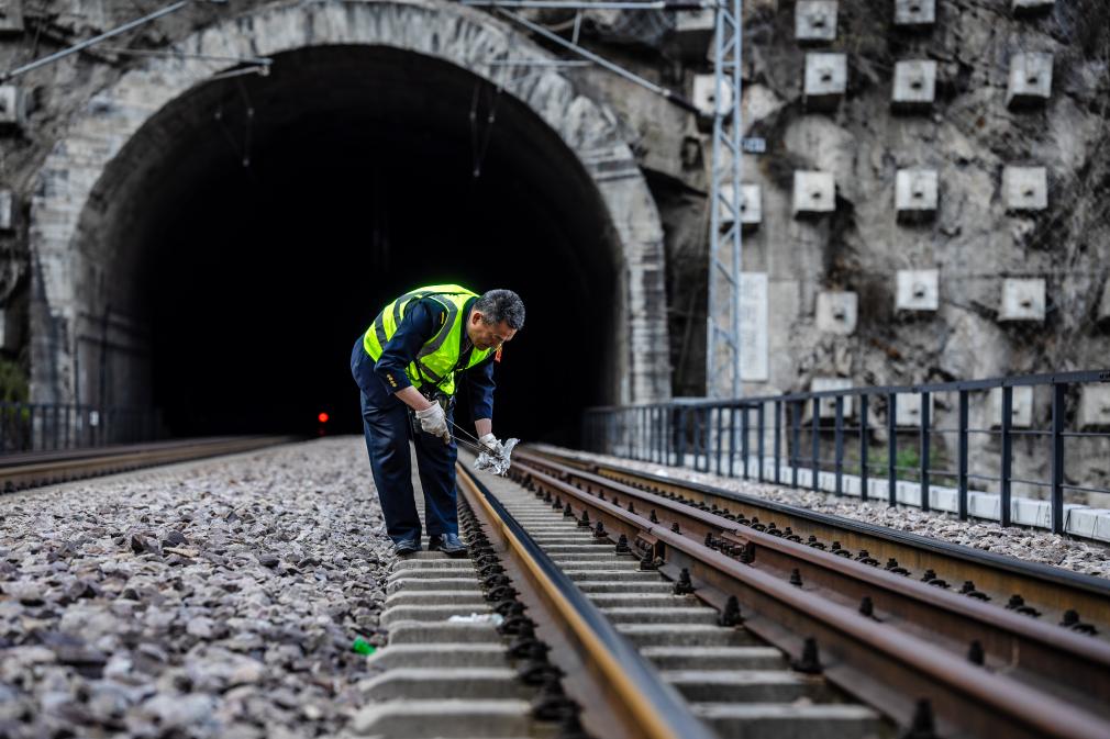 诸葛城站车站值班员李燕林在隧道里进行清扫道岔作业(1月21日摄)。