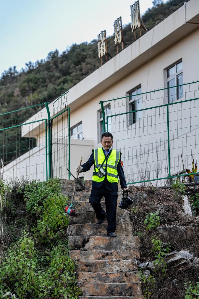 诸葛城站车站值班员李燕林拿着工具返回车站站房。