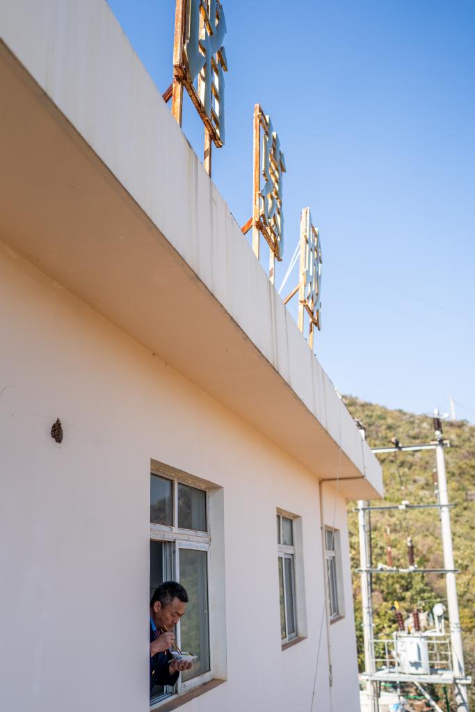 诸葛城站车站值班员李燕林在窗户边吃午饭(1月21日摄)。