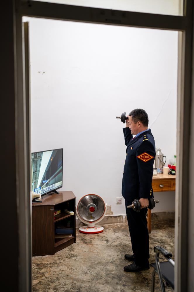诸葛城站车站值班员李燕林在晚饭过后一边看着电视一边锻炼身体(1月20日摄)。
