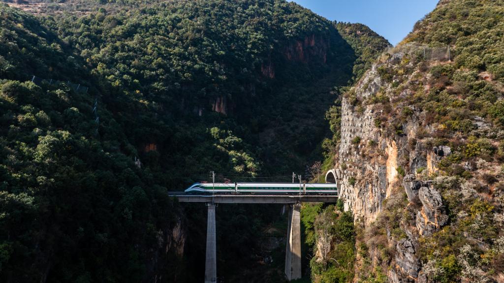 一列动车从诸葛城站的铁路桥上驶过(无人机照片,1月21日摄)。