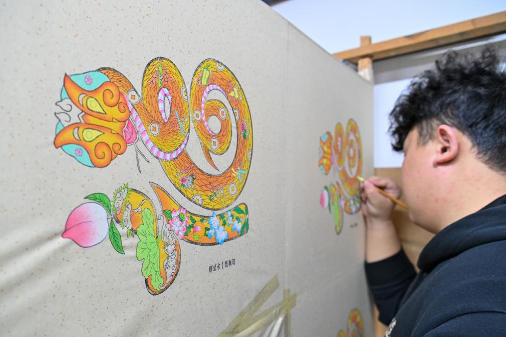 1月20日,在天津市西青区杨柳青镇霍氏古一张画店,画师在绘制年画《金蛇纳福》。新华社记者 孙凡越 摄