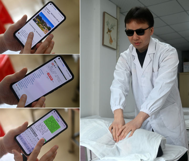 拼版照片。在广西南宁市一家盲人按摩店里,蓝宁在工作之余“阅读”文学作品(左上),蓝宁在展示自己发表过的文学作品(左中),蓝宁在工作之余构思写作(左下),蓝宁在工作中(右)。