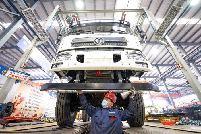 2025年2月13日,工人在位于湖北随州的程力专用汽车股份有限公司生产线上作业。新华社记者肖艺九摄
