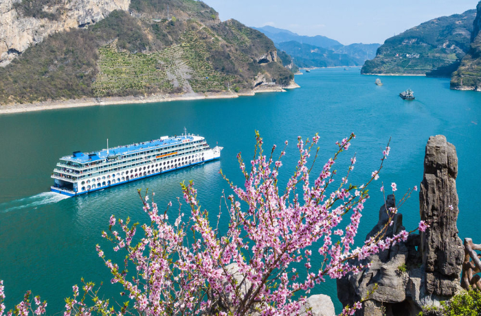 2025年3月19日,船舶行驶在长江三峡西陵峡湖北省宜昌市秭归县水域,岸上桃花绽放(无人机照片)。新华社发(郑家裕摄)