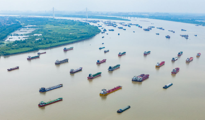 2024年6月1日,船舶在湖北武汉阳逻港区水域行驶(无人机照片)。新华社记者杜子璇摄