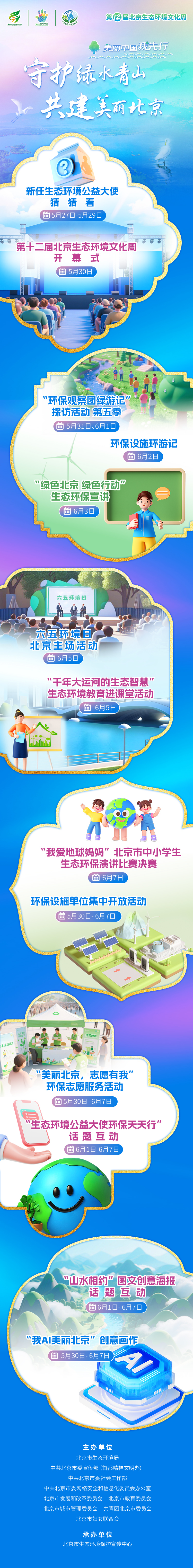 守护绿水青山,共建美丽北京。5月30日至6月7日,第十二届北京生态环境文化周将如约开启,13项生态环保宣传实践活动精彩纷呈。跟随公益大使实践绿色低碳生活、感受绿色地标的生态文化魅力、创意AI画作点亮美丽北京、见证北京市七个“两山”实践创新基地的生态成效……蓄势待发,向美而行,让我们携手共赴一场“绿色之约”。