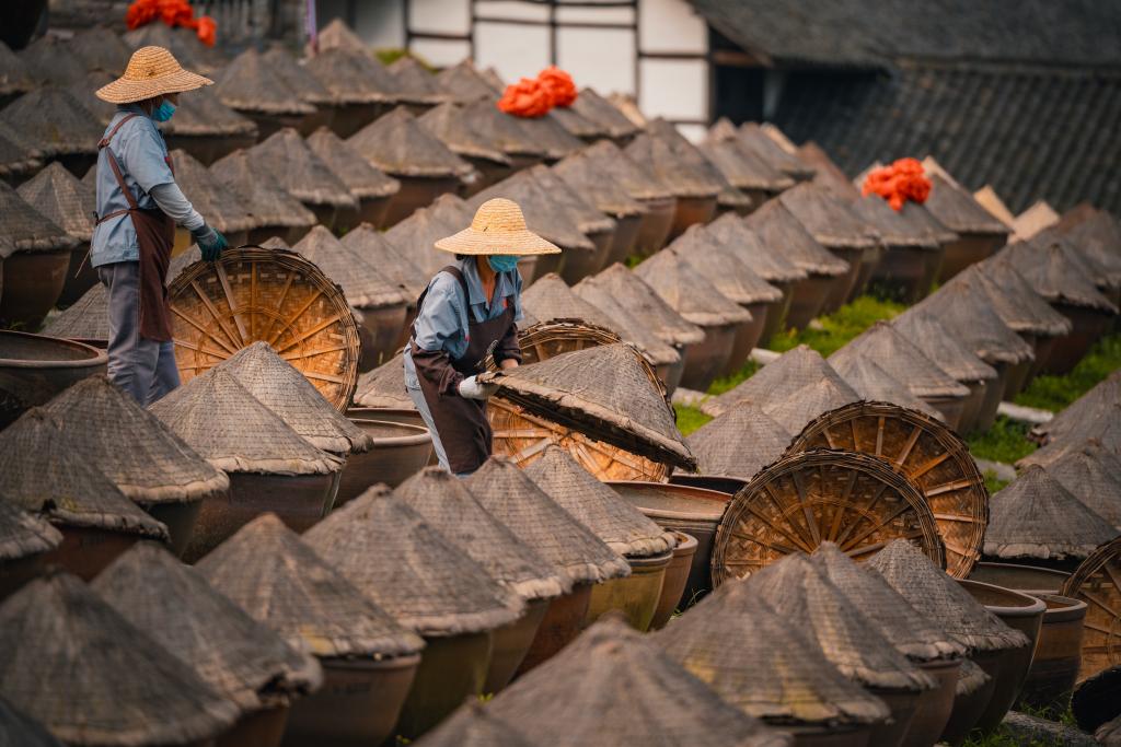 “先市酱油”的牌坊,格外显眼。据史料记载,先市酱园始于明末清初。天然制曲、三年晾晒发酵的古法酿造技艺,也从100多年前流传至今。