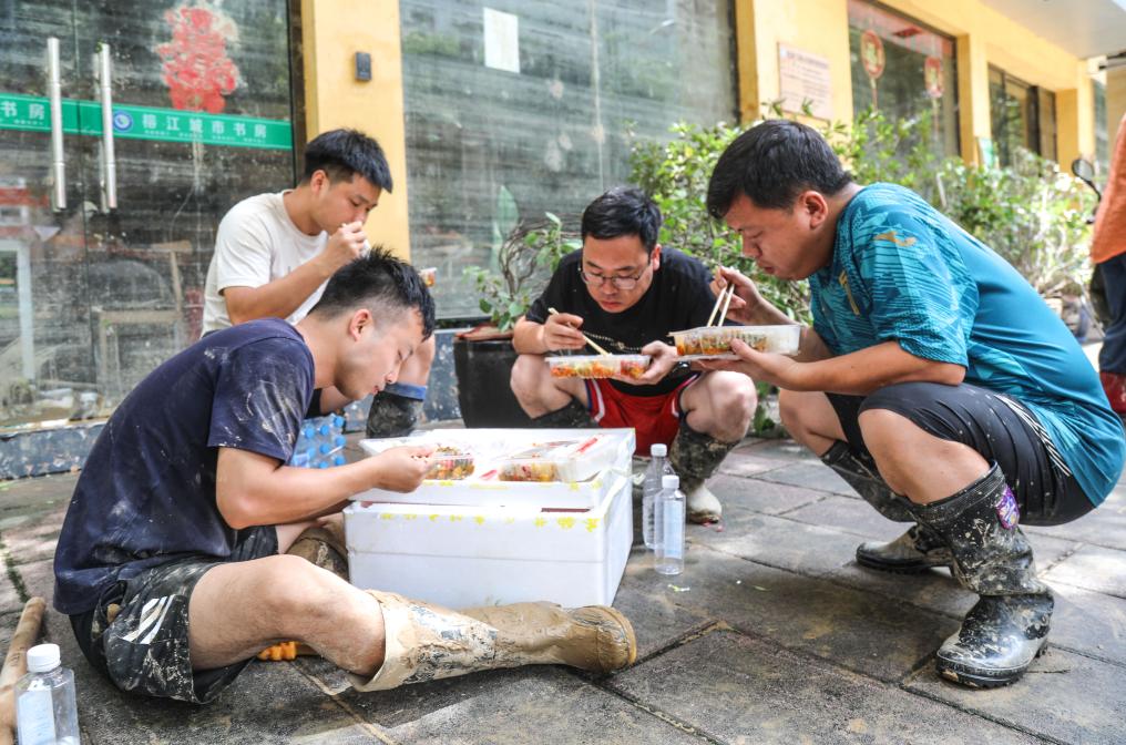 6月27日,在贵州省榕江县城,救援人员在救援间隙吃村民们送过来的盒饭。新华社发(余天英摄)